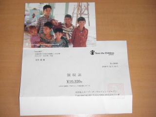 となり、先日「Save The Children」様より募金の受領書を郵送頂きました。